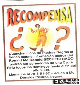 Well, that is NOTHING compared to what’s going on right now in Piedras Negras, Coahuila, where Ronald McDonald has gone “missing.” And, judging from this newspaper ad, we’re not talking theft here, but kidnapping.