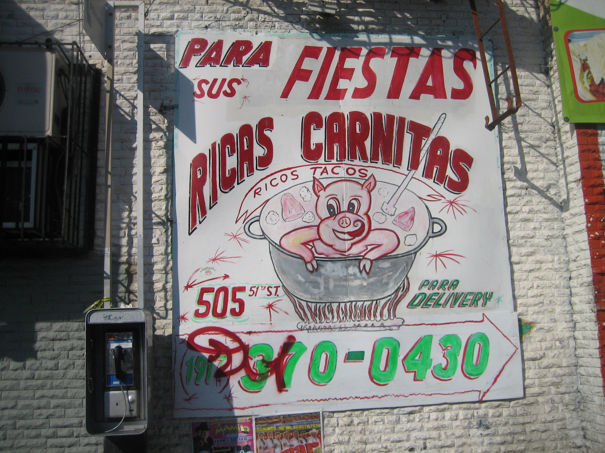 Proof of it is this wall advertising promoting ricos tacos de carnitas in Sunset Park, Brooklyn, also available para delivery.