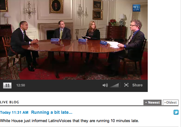 President Obama on Wednesday made history by answering questions from U.S. Latinos during a live Webcast from The White House (or as he likes to call it these days, La Casa Blanca.) And because the meeting was with Latinos, he dared show up 10 minutes late, which was cool with me ’cause I was taking a nap anyway.