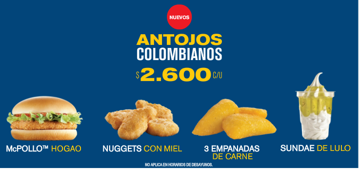 Well, after an unsuccessful attempt to cater to Mexican tastes by putting the Big Mac on a tortilla, McDonald’s is now launching Antojos colombianos (Colombian cravings,) a specially crafted menu for sale in Colombia that includes “some of the most recognized and traditional” foods of the country: The classic McPollo Junior (sic,) hogao sauce, empanadas, sundaes with lulo sauce, nuggets with honey, and original and unique options like ají sauce.
