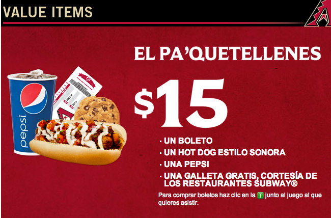 The Arizona Diamondbacks (@Dbacks) will offer a Sonoran-style hot dog at every home game for $7 at Red Hot Grill locations in sections 126 and 320. In addition, the team has partnered with Univision to offer a special Sonoran Dog Package, El Pa’quetellenes, for only $15 that includes an Outfield Reserve ticket, Sonoran-style hot dog, 24 ounce Pepsi and a coupon for a free cookie from SUBWAY® Restaurants. El Pa’quetellenes, presented by Univision, is available at every D-backs home game and can be purchased online at http://www.losdbacks.com.