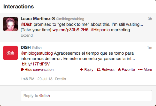 IMPORTANT UPDATE: On 07/29/2013 Dish responded to this post by a Tweet presumably written by a human being with very, very poor writing skills in Spanish.