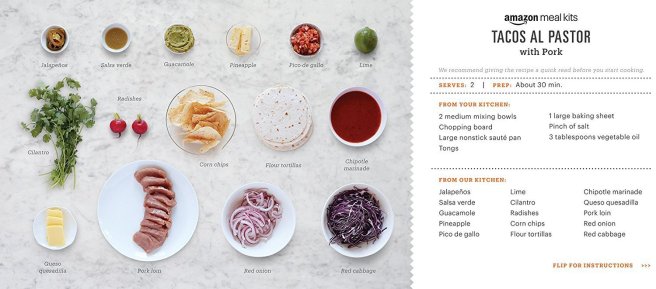 Starting very soon, Amazon will begin delivery of “Meal Kits,” a service similar to Blue Apron, which will provide you with all the pieces necessary to ensamble your own meal! Take the Tacos al Pastor kit, which includes jalapeños, salsa verde, chipotle marinade, pork loin, pineapple, cilantro, radishes, pico de gallo and — alas — flour tortillas, because this is America, people, and that’s that. So, suck it.