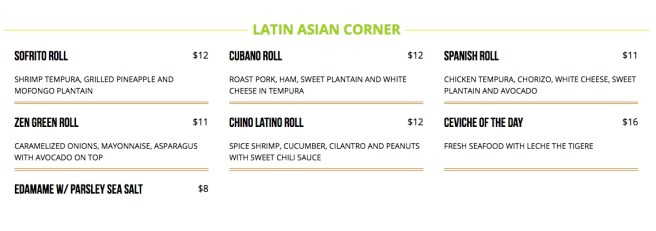 I went to check it out and was mostly tempted by the “Latin Asian Corner,” which features things like seafood with leche the tigere [sic] and a $12 Chino Latino Roll, whose latinidad comes – I guess – from the “Spice shrimp” and the cilantro.