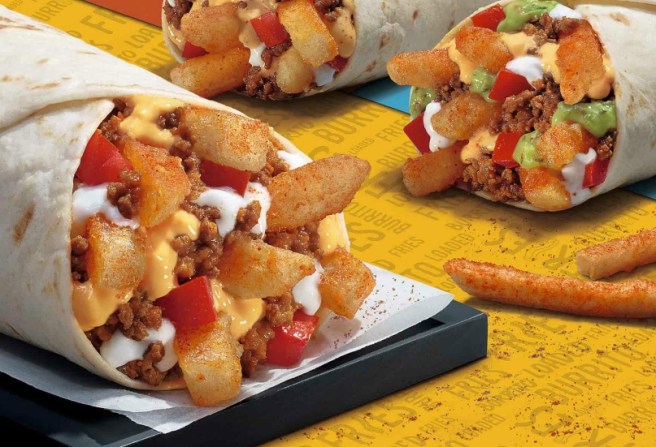 Introducing The California Loaded Fries Burrito, a burrito stuffed with –yes, you guessed it!– french fries and other things, including ground “beef” as the protein of choice, nacho cheese and sour cream.