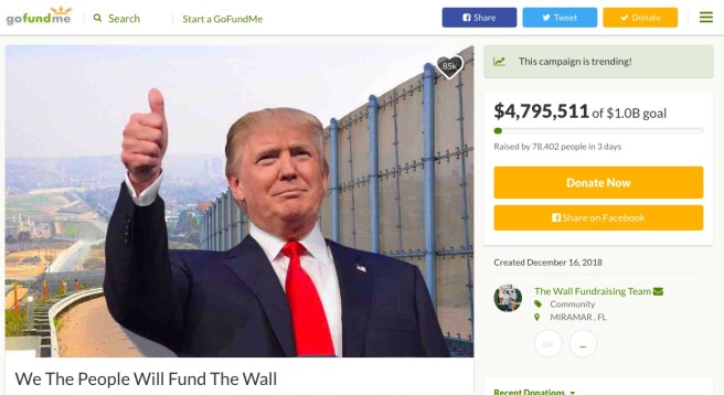 Trump supporter Brian Kolfage has set up a GoFundMe page to raise funds for Trump’s border wall because “President Trump’s main campaign promise was to BUILD THE WALL. And as he’s followed through on just about every promise so far, this wall project needs to be completed still.”