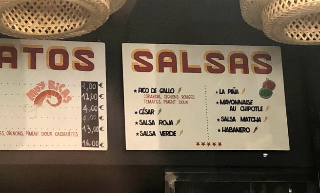 Behold Chiquitin, the newest addition to Rue Henry Monnier (this blog’s temporary headquarters). The 10×10 meter changarrito is the take-away petit branch of Luz Verde, just across the street, and it features all sorts of salsas, including old time favorites like roja, verde and pico de gallo, but other more inventive like mayonnaise au chipotle, césar and –wait for it– salsa matcha.