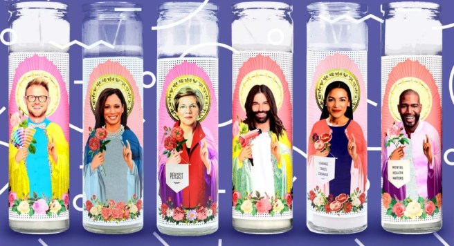According to this Vox.com article, a prayer candle featuring the likes of Elizabeth Warren, Alexandria Ocasio-Cortez or Jonathan Van Ness (because they all kind of are in the same business) can cost up to $12, compared to a regular prayer candle, which you’ll find pretty much anywhere in the USA for $2 –or for very few pesitos in any Latin American street market.