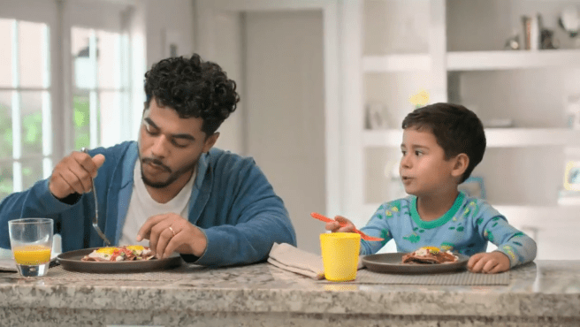 Pan out to a scene where dad & kid are having breakfast (¿huevos rancheros?) and kid blurts out: “Dad, I want to play hockey.”
