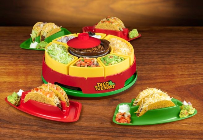 The Nostalgia Taco Tuesday Heated Lazy Susan Topping Bar is a fun way to get together on Taco Tuesday and share hideous, non-taco tacos with your friends. The set costs “only” $39.99 (plus shipping) and promises to hold as much plasticky, fake Mexican food you can imagine!