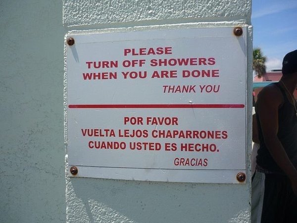 The above sign was spotted at a posh resort, but I’m pretty sure they did not use Google to translate the text into Spanish. I literally just pasted the English text into my Google Translate app, and it came up with a pretty decent Por favor, apague las duchas cuando haya terminado.