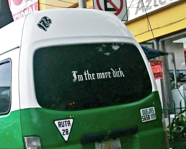 Speaking of my homecountry –and awesome translations– I give you this CDMX pesero, whose owner has earned a spot on this blog for being exactly what he claims to be: The More Dick –presumably “El más verga.” Go ahead and find me a better translation. I’ll wait.