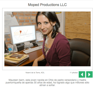 (AOL) Broolyn, N.Y.- En estas épocas de incertidumbre laboral y económica, son pocas las personas que dicen estar satisfechas -y súper comprometidas- con sus carreras. Maureen Isern es una de ellas.Con apenas 30 años de edad, esta joven nacida en Ohio de padre venezolano y madre puertorriqueña, ha logrado algo que millones sólo atinan a soñar: trabajar en lo que le apasiona y sin necesidad de reportarle a nadie más, pues desde hace más de dos años es dueña de su propia empresa: Moped Productions LLC, una consultora de medios y productora de videos con sede en Brooklyn. Nueva York.